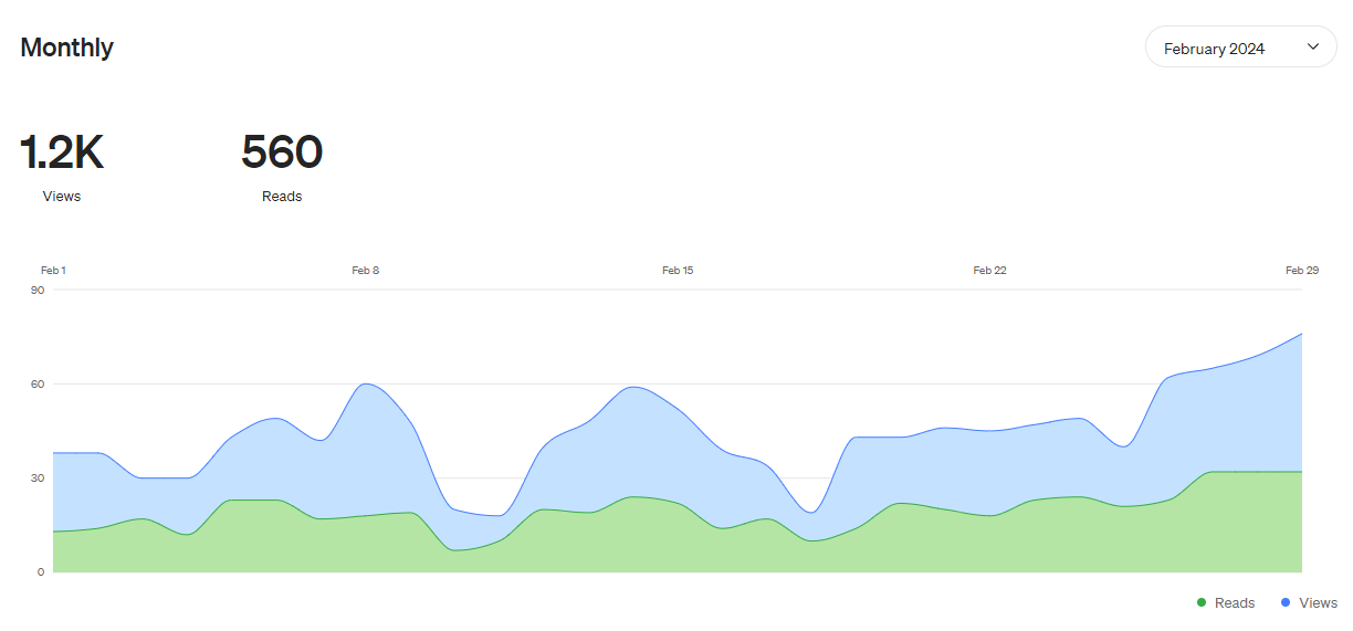 As mentioned above, in February of 2024, I hit the first month on Medium where I had over 1,000 people view my article. This was really exciting for me, I’d been putting in more effort on Medium to see what potential it could hold.