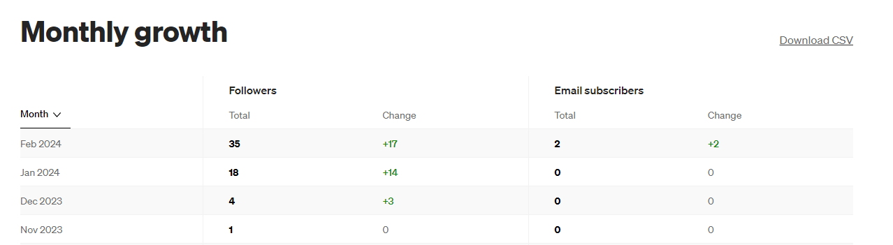 I found that my followers went up, but I also started following new people too and engaging with other Medium writers. So I actually went from 1 following in November 2023, to now having 35 followers and 2 email subscribers.